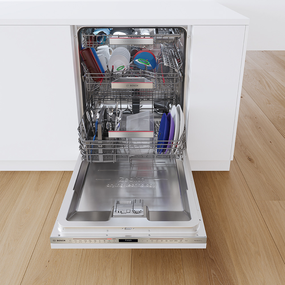 Mehr Leistung. Weniger Energieverbrauch. 100% vernetzt. Die neuen PerfectDry Geschirrspülmaschinen von Bosch. Beim Ausräumen des Geschirrspülers müssen häufig Geschirrteile, insbesondere Kunststoffgeschirr, von Hand nachgetrocknet werden. Nicht so bei den PerfectDry Geschirrspülern. Durch die patentierte Zeolith ® Technologie erzielen sie perfekte Trocknungsergebnisse. Das natürliche Zeolith-Mineral nutzt die Feuchtigkeit der Reinigungsphase und wandelt sie in Heißluft um. Mit einem kräftigen, gleichzeitig aber auch sanften 3D-Luftstrom wird Heißluft im gesamten Geschirrspüler verteilt und sorgt für eine effektive Trocknung aller Geschirrteile.